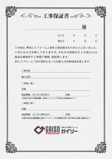 ガイソーでは、リフォームした後も安心して暮らしていただくために工事完了後に工事内容に応じた保証書を発行しております。