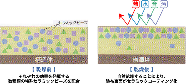 そのセラミックビーズは、外壁に塗る前はバラバラに浮遊していますが、塗布後は乾燥しながら表面に集まり、層を作って外壁をコーティング。層を作ることで、熱の移動を遮って断熱効果を発揮します。